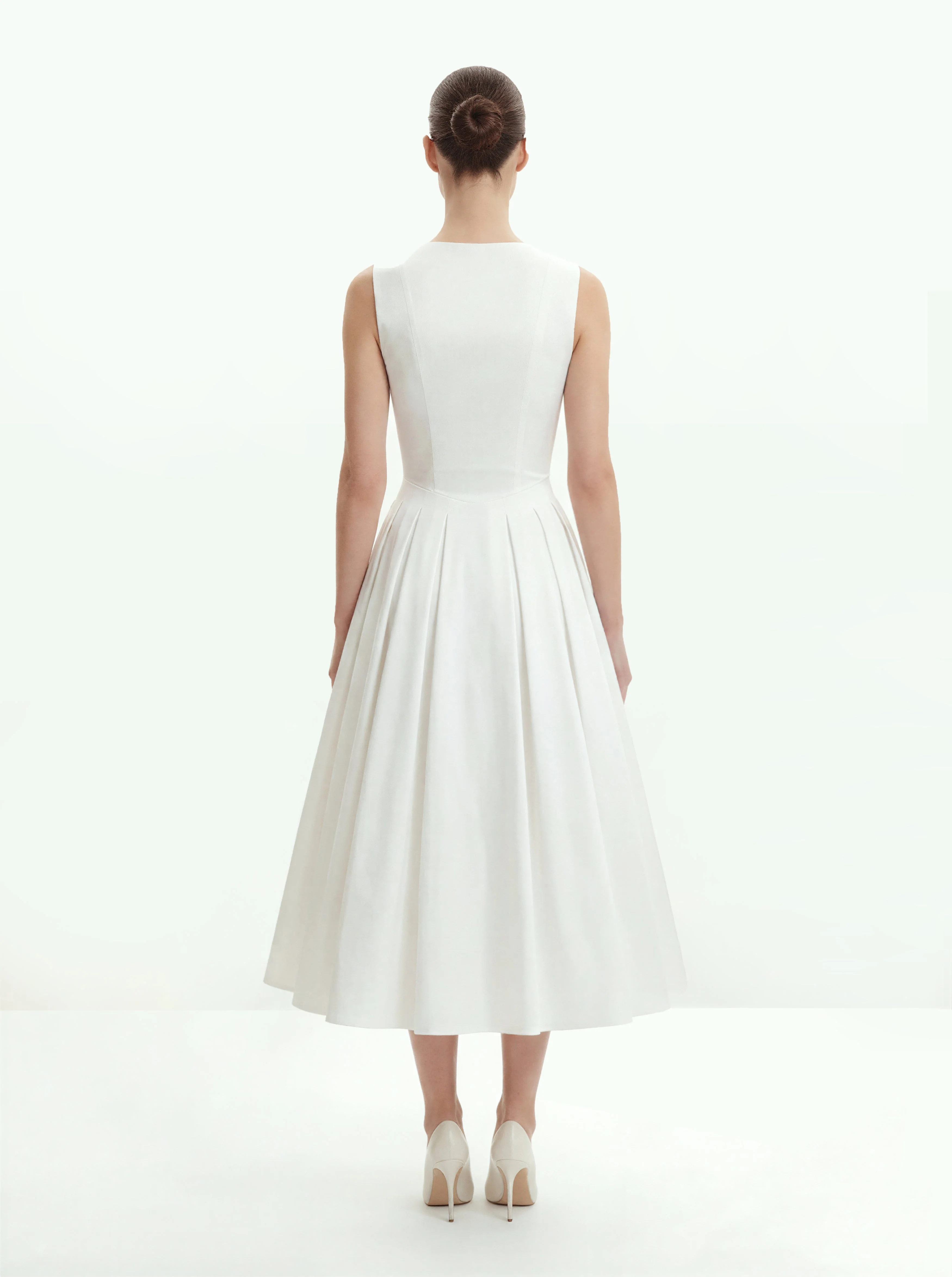 Front V-Neck Pleated Midi Dress - White