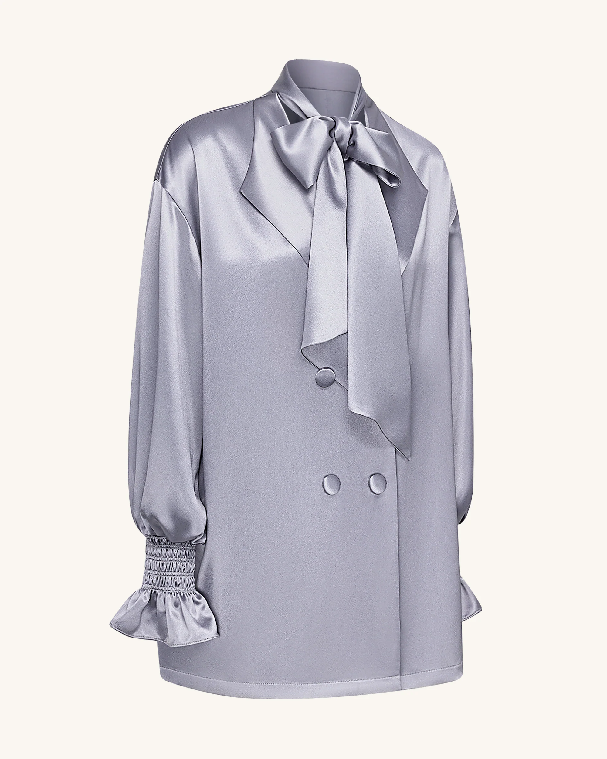 -70%Ribbon Tie Balloon Sleeve Longline Blazer - Silver—